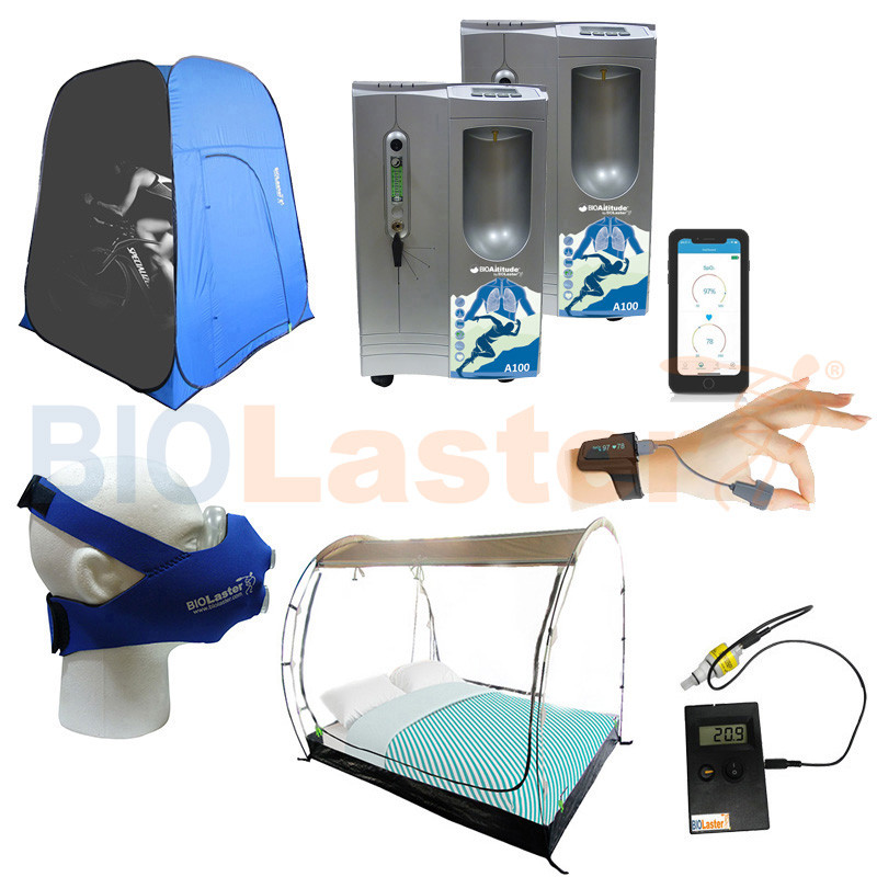 Se compone de Tienda de hipoxia Portable + Generador BioAltitude® A100 + Máscara de entrenamiento Biolaster + Pulsioximetro de muñeca BCOxygen Oxysleep Básico.