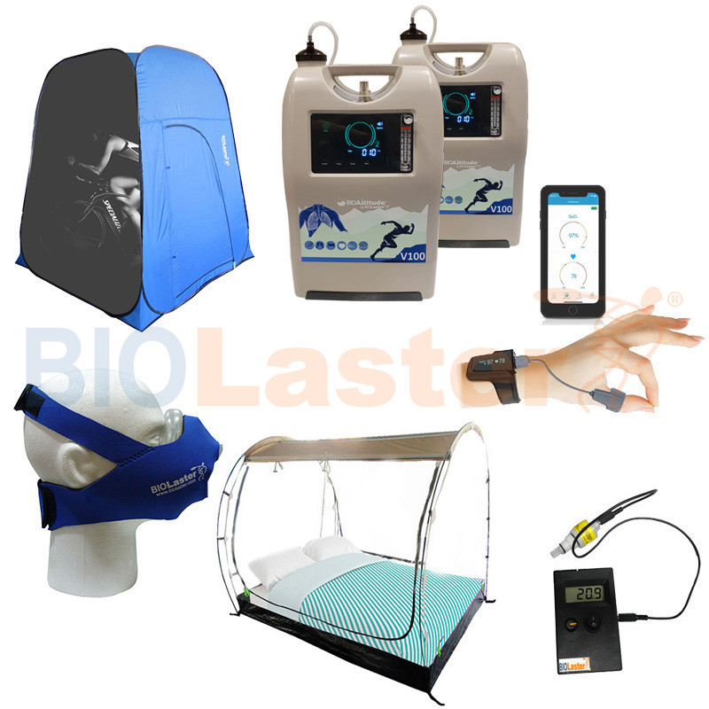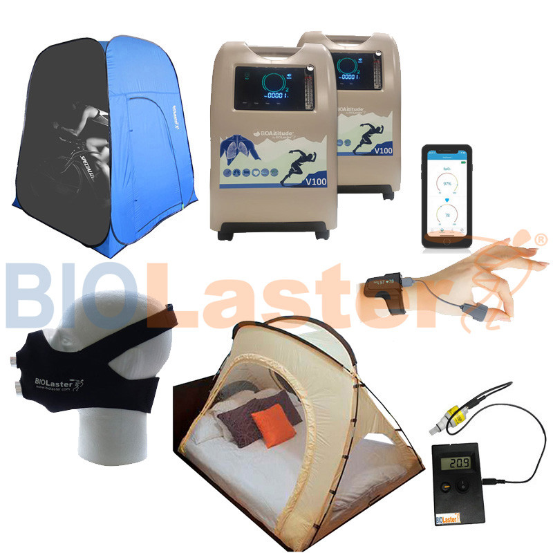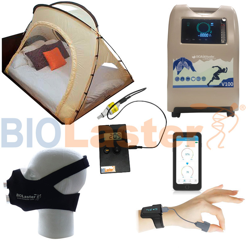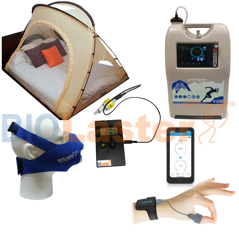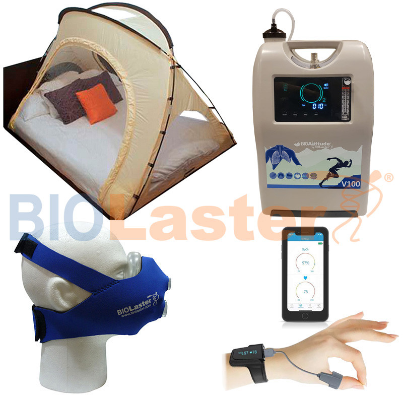 Se compone de Tienda de hipoxia Portable + Generador BioAltitude® V100 + Máscara de entrenamiento Biolaster + Pulsioximetro de muñeca BCOxygen Oxysleep Básico.